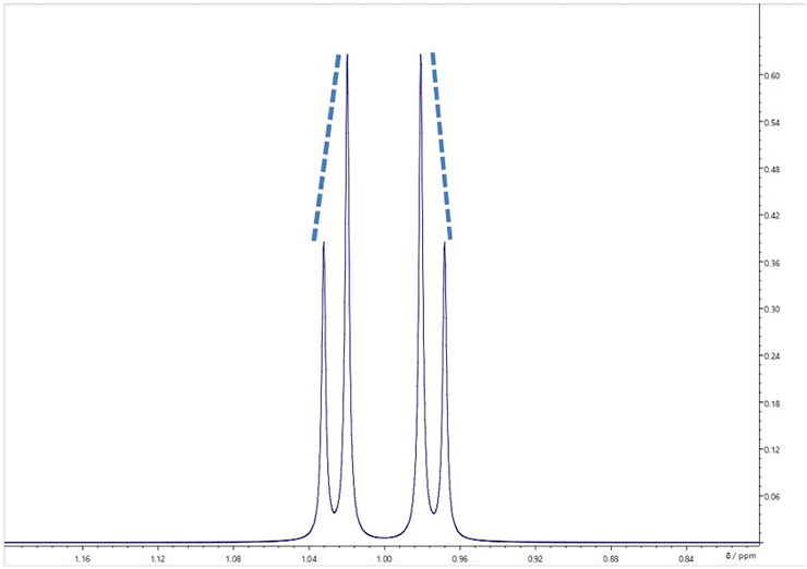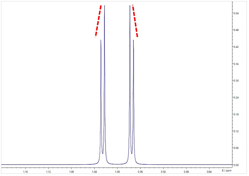 关于二阶效应,NMR装置的磁场强度越高,以Hz表示的化学位移差Δ越大,这减少了二阶效应的影响。