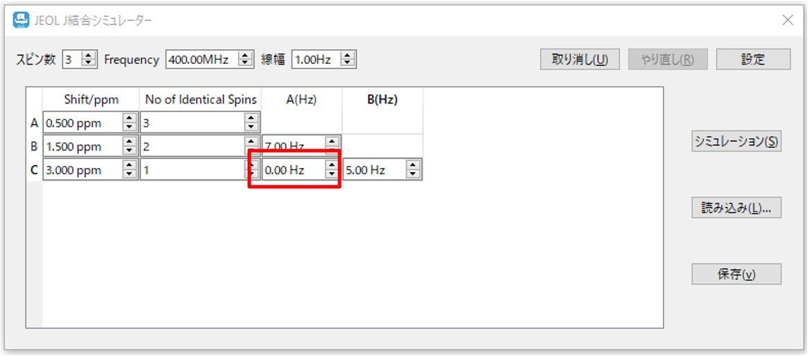 对于信号A、信号B和信号C的3自旋系统也可以进行模拟。如果要模拟信号A和信号C之间没有耦合的情况,请将其设置为0Hz。