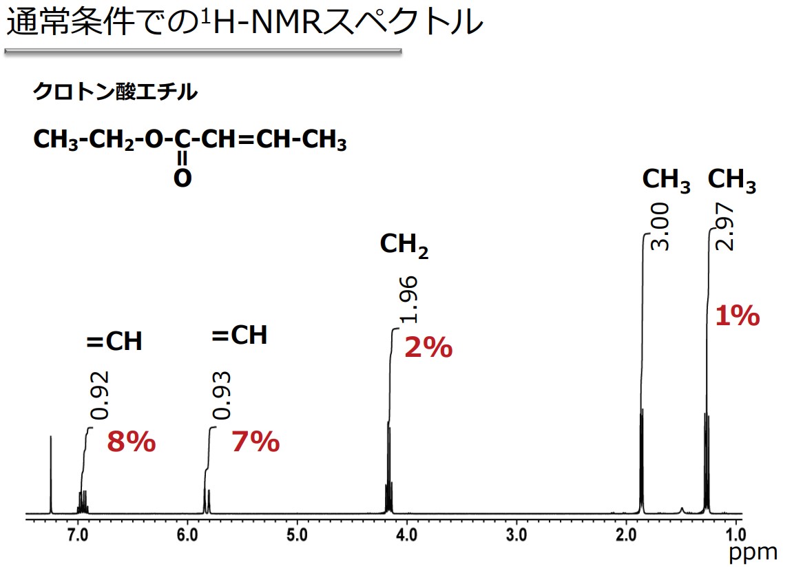让我们看看分子内积分比。作为结构分析的信息,分子内积分比为1:1:2:3:1是可以的,但当我们仔细检查数据时,观察到双键部分的积分比要低7-8%。因此,仅看这个结果就说明定量测量的条件不充分。