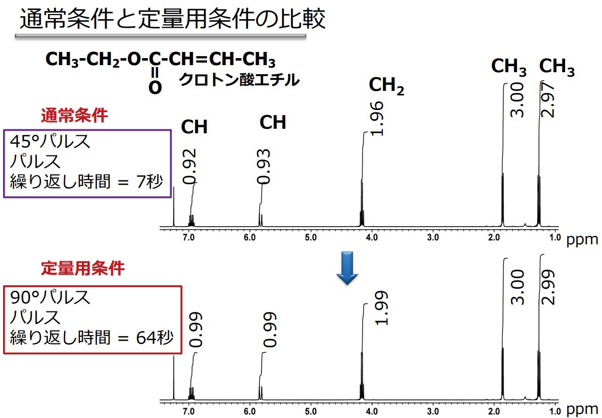 让我再解释一下。 NMR用无线电波脉冲照射置于磁场中的核自旋,并观察此时核自旋的行为。受脉冲影响的核自旋需要一定的时间才能恢复到原始状态。如果没有足够的时间返回到原始状态,则随着重复积分,定量将会丢失,导致无法定量的谱图。换句话说,在定量测量中,在脉冲之间设置足够的重复时间很重要。