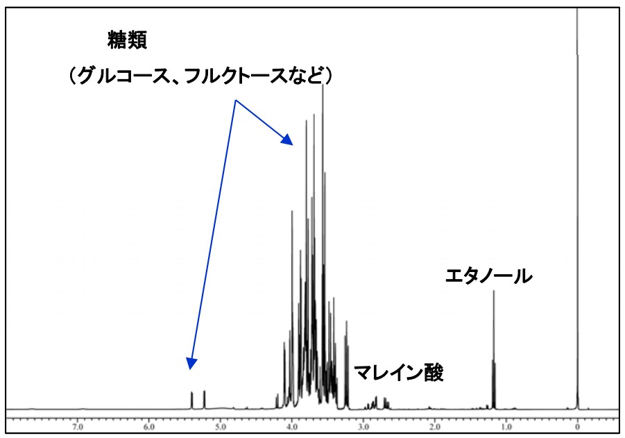 用于分析含有聚合物、化学物质等多种成分的样品成分分离分析として液体クロマトグラでも分析が可能ですが、NMRでの分析では分离分析でないものその属性を利用した效率的な分析が可能です。分离分析ではないという点は精确な成分比を求めるためには注目成分由来のNMR信号がsupekutoru上で分离し、なおかつその信号が単独である(不纯物と重ならない)ということが必要条件となります。然而,如果条件合适,则可以使用一种测量条件有效地定量多种成分。图为苹果汁1This is an H-NMR spectrum, and you can see the signals of ethanol and sugar In the case of apple juice, ethanol and sugar can be observed separately, allowing for qualitative and quantitative analysis In this way, it is extremely efficient to be able to perform qualitative and quantitative analysis simultaneously without changing conditions