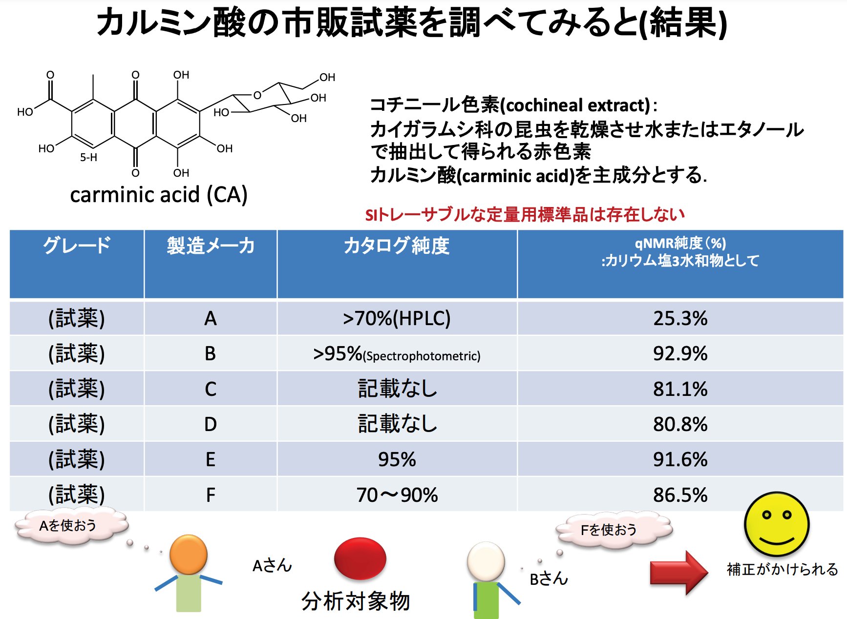 在这里,我们展示了使用定量 NMR 评估各种胭脂红酸纯度的结果。 (表 1)