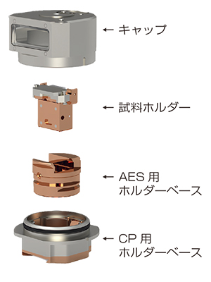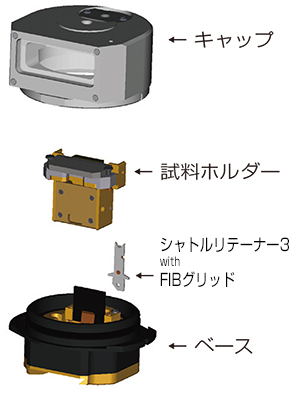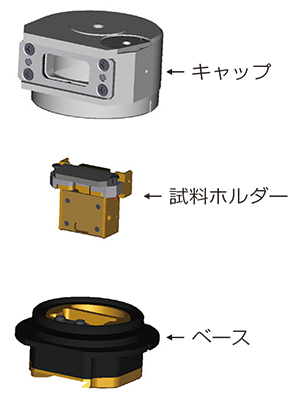 使用转移容器,可以在不暴露的情况下运输每个分析设备并与其协作。转移容器具有各种用底座和盖子密封的样品架,如下所示。与转移容器不兼容的 TEM 和 XPS 也可以使用如下所示的专用非曝光/分析支架,无需曝光即可使用。