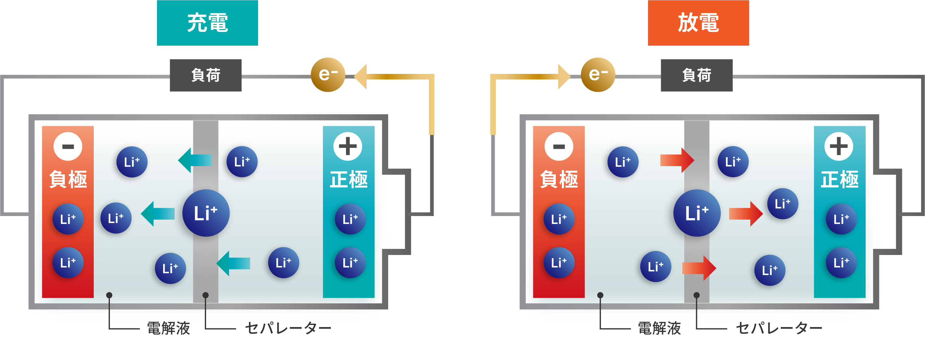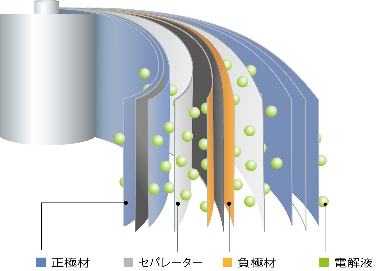 电解质负责在锂离子电池中传输锂离子。将离子物质溶解在水等极性溶剂中制成的具有离子导电性的溶液。一般锂离子电池电解液含有碳酸亚乙酯(EC)、碳酸二甲酯(DMC)和碳酸二乙酯(DEC),因此即使在高电位下也能在不氧化分解的情况下运行。另一方面,有机溶剂由于重复的充电/放电循环、过度放电和过度充电而分解,从而降低电解质的功能。此外,虽然有机溶剂电解质比水溶液具有更高的耐电压,但它们是易燃的,根据消防法(易燃液体)属于危险物质。在过充电状态下,正极材料劣化,释放的氧气氧化分解电解质,导致气体产生。此外,在过度放电的情况下,用于电池负极的铜箔会熔化。