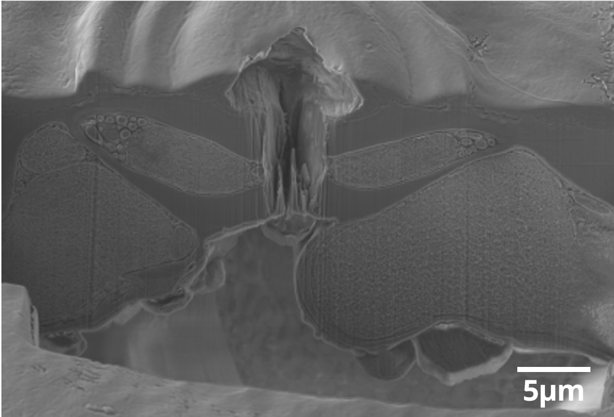 使用 CRYO-FIB/SEM 对茶梅叶的气孔进行横截面处理和观察。冷冻断裂法难以获得孔隙等微小部位的截面,而采用CRYO-FIB/SEM法则可以轻松加工特定部位的截面。