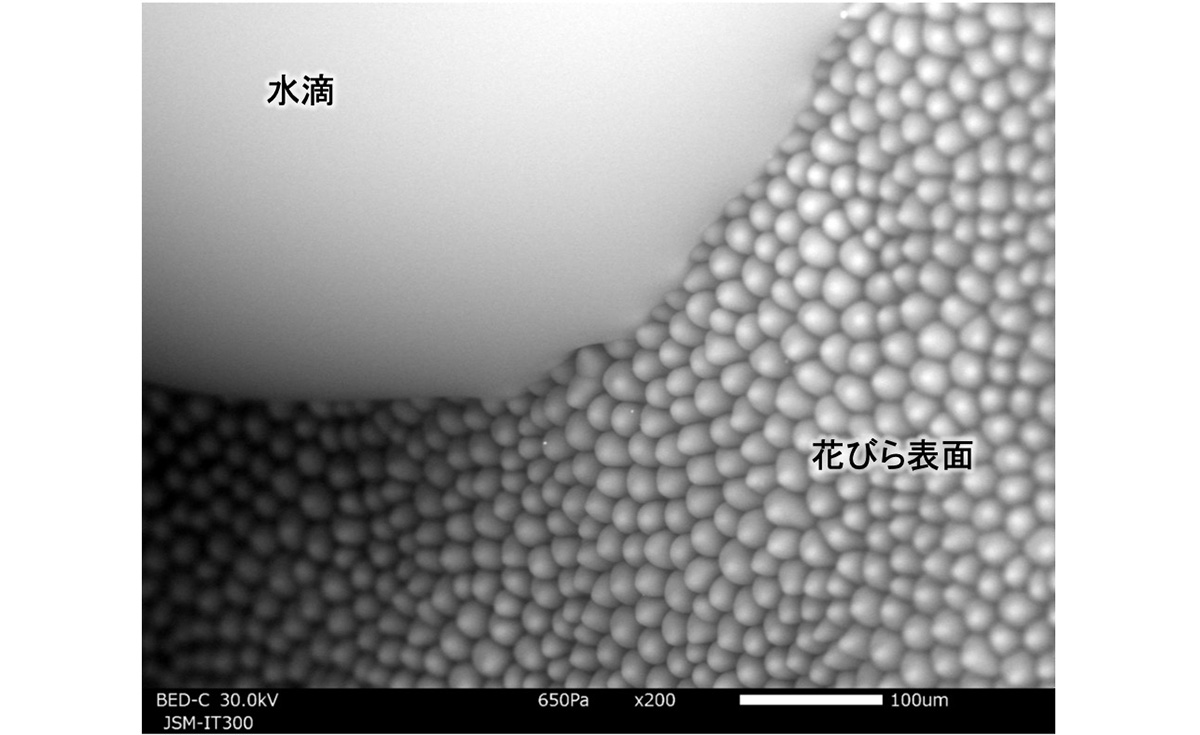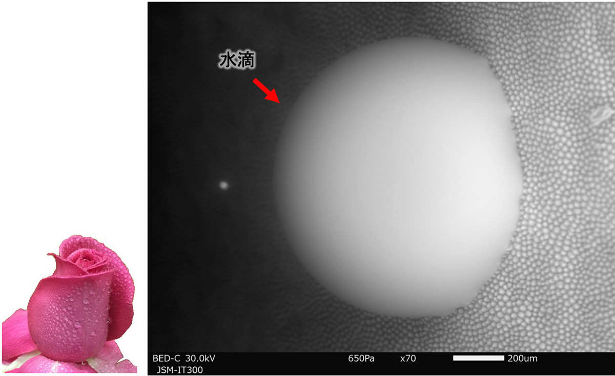 Aqua cover 法是一种使用 SEM 观察水作为液体的方法。使用这种方法,我们观察了附着有水滴的玫瑰花的表面。这样可以详细观察由莲花效应引起的防水性。