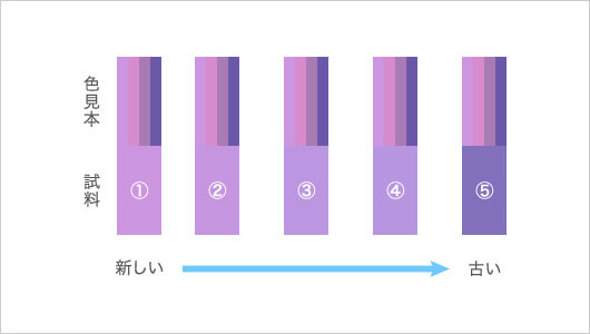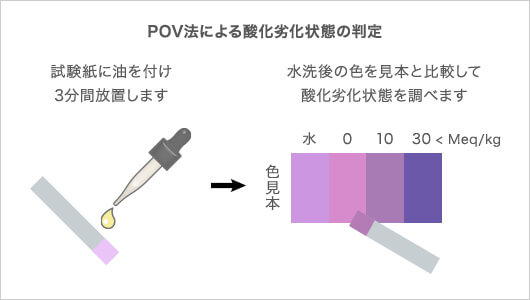那么,油品质量是如何控制的呢?它是由 JAS 法(日本农业标准)规定的。油的氧化程度通过 POV 法(POV:过氧化值)进行评估,这是一种测量油分子中过氧化物的方法。 POV 方法使用的试剂会产生较深的颜色,因为油中含有更多的过氧化物。还提供测试条以方便测量。使用时,将油涂在试纸上,让其反应,然后用水清洗,并与颜色样品进行比较,以测量氧化变质的状态。一般在10~30Meq/kg之间氧化开始进行,如果超过30Meq/kg,则判定产品因氧化而变质。*Meq(毫克当量)是表示过氧化物量的单位