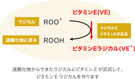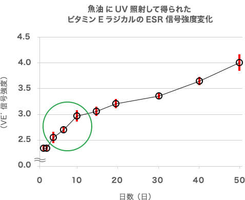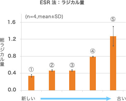 让我们看看 ESR 如何测量过氧化物。油脂中因氧化变质而产生的过氧化物,受到外界刺激光的照射时,会分解成自由基。然而,如上所述,这里产生的自由基不稳定,因此很难直接使用 ESR 来测量它们。食用油中所含的维生素E就是用于此目的。维生素 E 与过氧化物产生的自由基发生反应,生成维生素 E 自由基。由于这种维生素 E 自由基很稳定,因此可以使用 ESR 轻松测量。