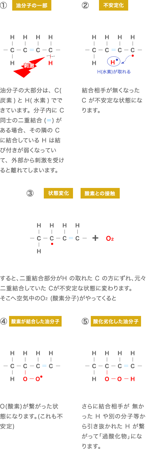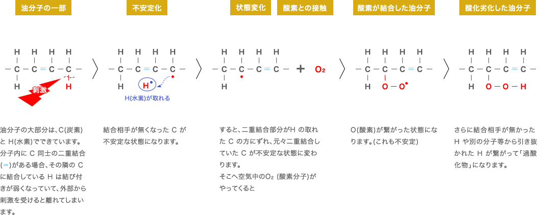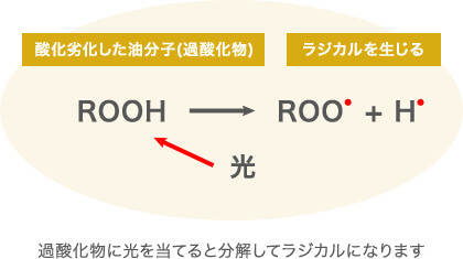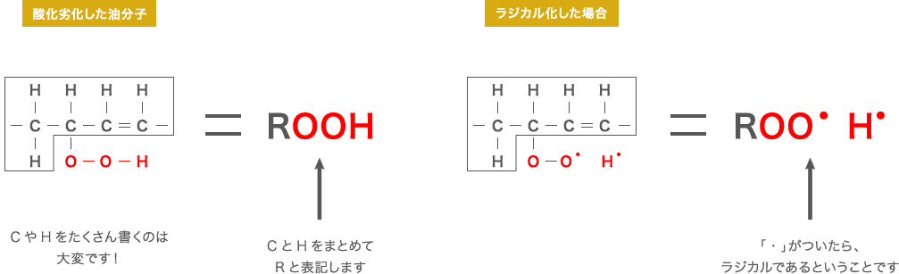 因氧化而劣化的油分子缩写为C和H,并写作“ROOH”。此外,当激进时,“ROO・”后面会有很多解释,请参考。