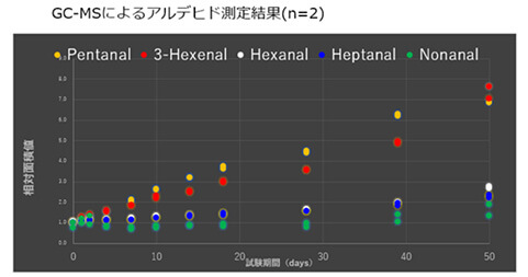 此图显示了五种醛测量两次后的变化,第一天每种醛的量设置为1。从第二天开始,观察到戊醛和3-己烯醛等醛的增加。此外,另一种醛,壬醛,直到第28天才发生变化,但此后,与其他醛一样,随着时间的推移,其量不断增加。结果显示,鱼油从第二天开始就因氧化而逐渐变质。即使只是短期储存,也必须注意油的储存条件。