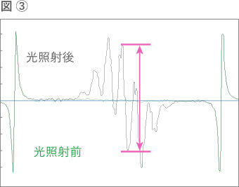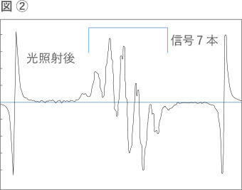 下图显示了使用 ESR 测量菜籽油中维生素 E 自由基的结果。绿线(图 1)是施加光之前的结果。缺乏维生素 E 自由基导致基线笔直。黑线(图2)是光照后的结果。有7个信号显示维生素E自由基的ESR信号。当过氧化物较多时,会产生大量过氧化物自由基,同时也会产生大量维生素E自由基。因此,可以通过测量维生素E自由基的量来确定氧化变质的程度(图3:粉色箭头的高度)。