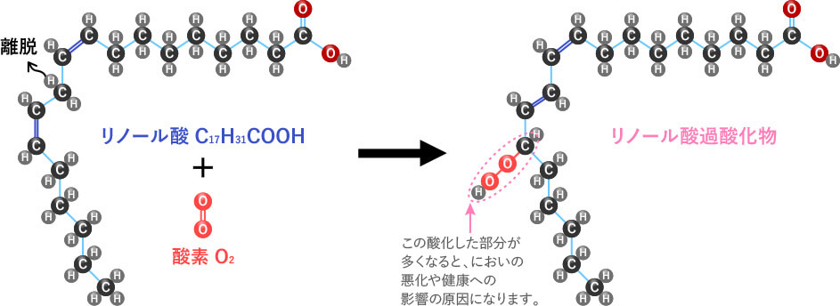 然而,这种油在暴露于氧气时会变质。即使您没有注意到旧油的气味,或所谓的氧化气味,氧化变质也在储存过程中一点点进行。降解的油会对您的健康产生负面影响,因此尽可能食用未氧化的新鲜油非常重要。那么,油品氧化变质的机理是什么?它是由分子的微小变化而产生的。氧化油的真正本质是“过氧化物”,它是由油分子和氧分子之间的反应产生的。例如,在以分子模型表示的亚油酸的情况下,氧以以下形式连接(一个示例)。