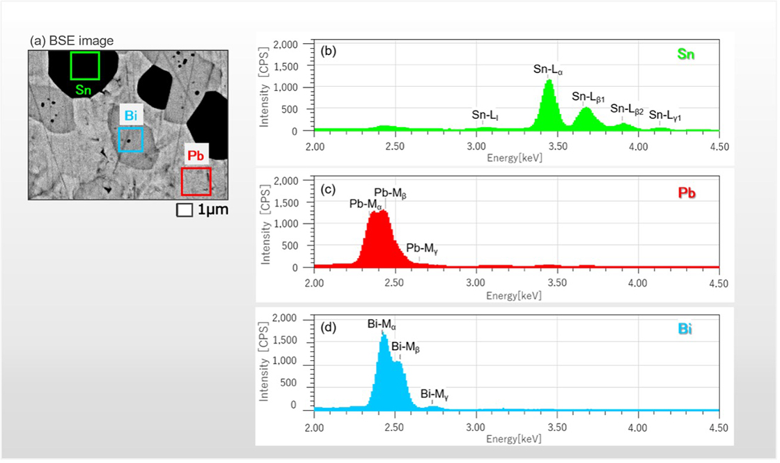 图。图3(a)显示了用背散射电子拍摄的SnPbBi合金的成分图像。 X射线光谱是从绿色、红色和蓝色表示的矩形区域测量的。在绿色区域观察到 Sn 光谱,在红色区域观察到 Pb 光谱,在蓝色区域观察到 Bi 光谱。其他。因此,在整合 ROI 强度的计数图中,包含 Pb 和 Bi 的区域混合在一起,而不是分离。