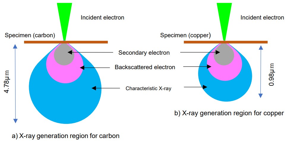 当样品受到电子束照射时,电子与样品内部的原子碰撞并渗透到一定深度,同时损失能量。在此过程中,核心电子被喷射并产生特征X射线。特征X射线在距离样品表面几十纳米到几微米的深度处产生。特征X射线的产生区域取决于样品的入射电压、平均原子序数、原子质量和密度。对于由树脂或玻璃等轻元素制成的样品,产生特征 X 射线的区域又深又宽。如果它是由SUS或黄铜等重元素组成的,则生成区域会浅且窄。图1示出了当电子束以20kV的入射电压入射到碳(C)和铜(Cu)上时产生特征X射线的区域的示意图。对于碳 (C),特征 X 射线产生区域的深度约为 48 µm(图 1a)。对于比碳重得多的铜 (Cu) 元素,产生特征 X 射线的区域减小至约 1 µm 的深度(图 1b)。