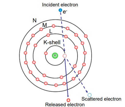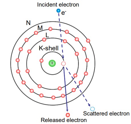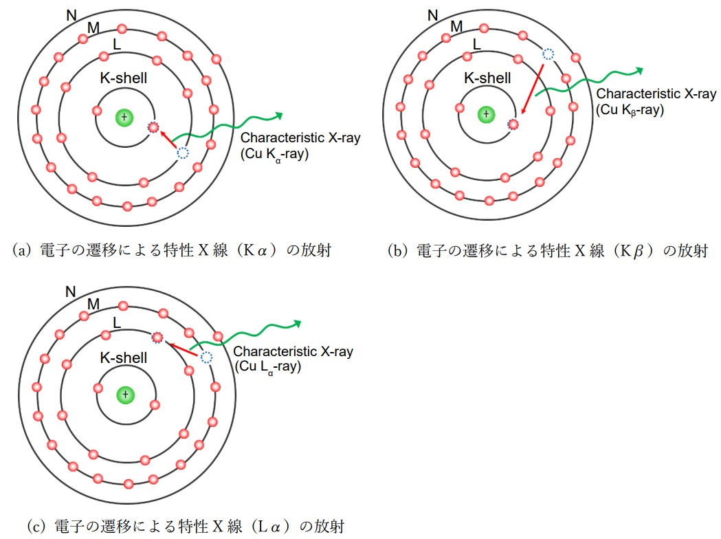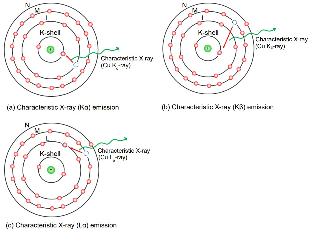图。图2示出了受电子束照射的Cu原子中特征X射线的产生过程。当入射电子与内层电子碰撞时,受影响的电子会从原子中弹出。然后,在内壳轨道中产生空位或空穴,使原子不稳定。为了返回稳定状态,处于较高能量轨道的电子跃迁到所产生的空穴。在这种情况下,会发射特征 X 射线,其中两个轨道之间存在能量差。当电子从L壳跃迁到K壳时,特征X射线称为Kα线(图3a)。参与其发射的轨道。