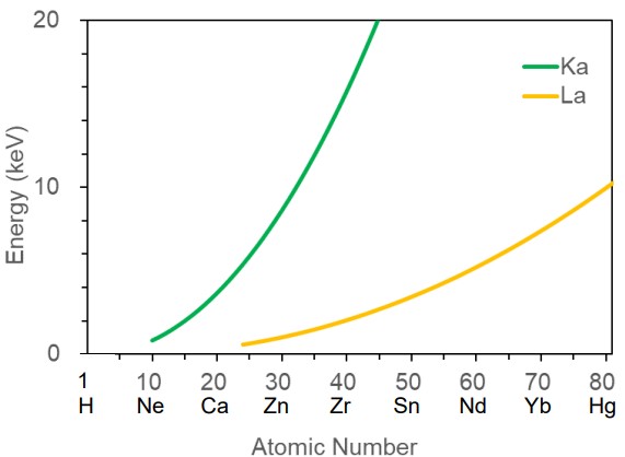 为了产生特征X射线,入射电子的能量必须等于或大于喷射内壳层电子所需的最小值,称为吸收边。例如,Cu的K吸收边为8979 keV;因此,理论上,9 kV 或更高的入射(着陆)电压就足够了。然而,为了获得具有足够特征X射线强度的光谱,通常将着陆电压设置为目标元素特征X射线能量的两倍左右。对于 Cu,15 kV 的着陆电压足以获得 Kα 线的高强度光谱 (804 keV),如图 4 所示。图。图 5 展示了特征 X 射线(Kα 和 Lα 线)的能量如何随原子序数增加。该图表明,15 kV 的着陆电压足以激发几乎所有元素的特征 X 射线。对于由较轻元素组成的样品,可以通过将着陆电压降低至10 kV甚至5 kV来获得足够高强度的X射线光谱。因此,在元素分析中,根据样品的原子序数正确设置着陆电压非常重要。