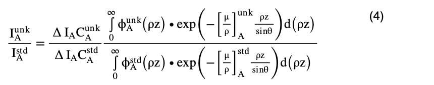 这里,[μ/ρ] 是样品中元素 A 特征 X 射线的质量吸收系数,并且θ是 X 射线探测器相对于样本表面的起飞角度。